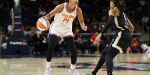 Aug 19, 2025; Washington, District of Columbia, USA; Connecticut Sun guard Bria Hartley (14) tries to slip past Washington Mystics guard Sug Sutton (1) during the second half at CareFirst …
